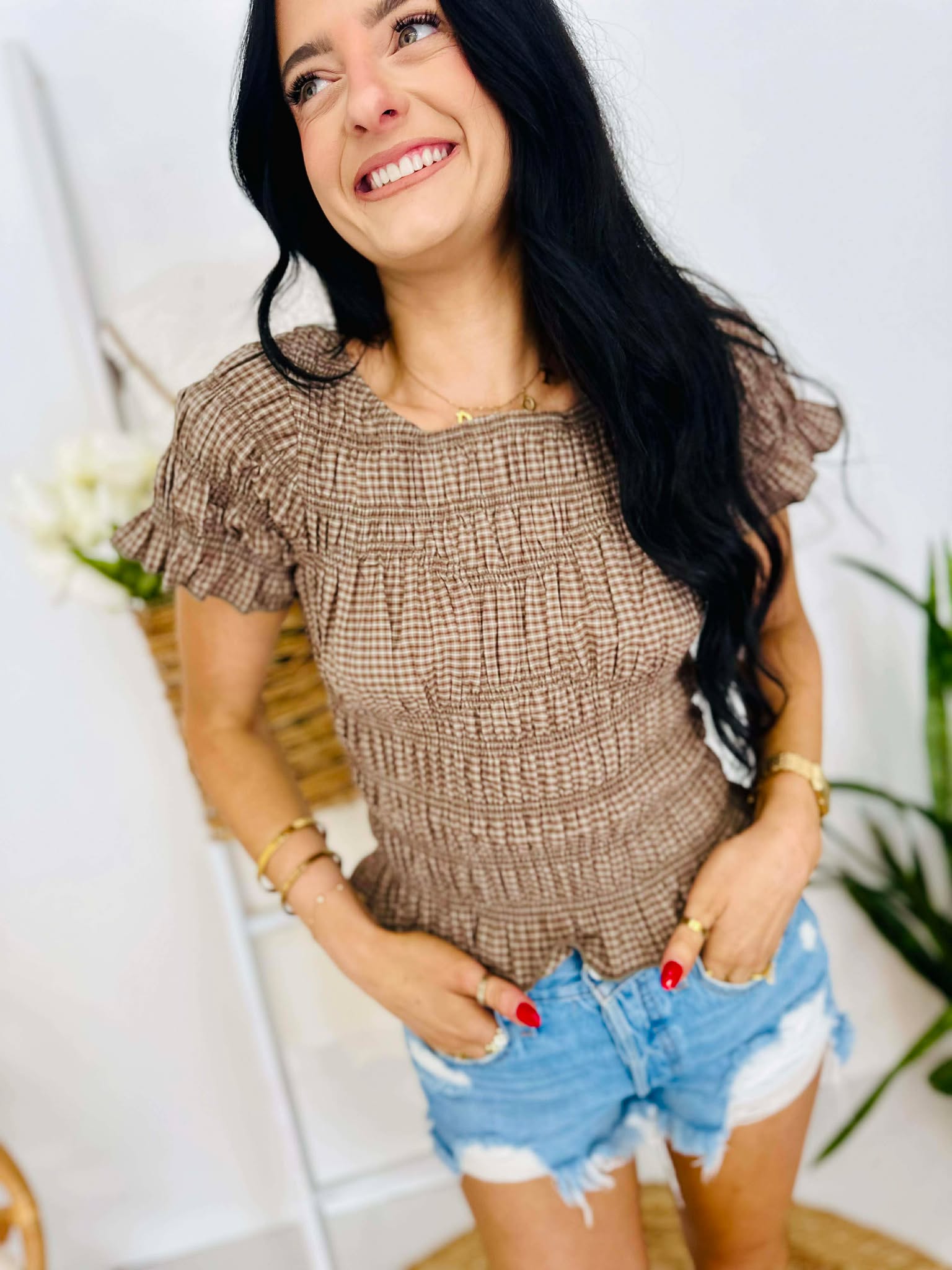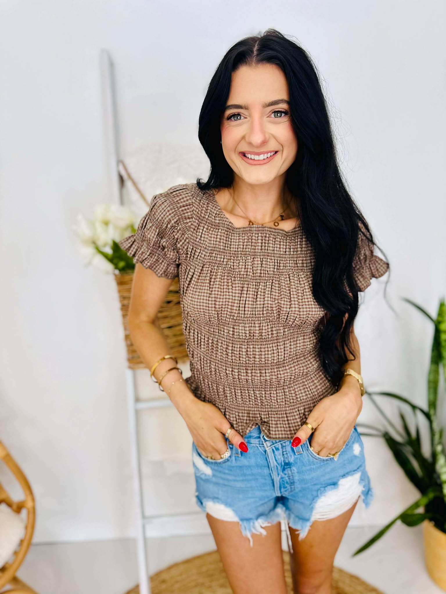 Plaid Smocked Short Sleeve Top