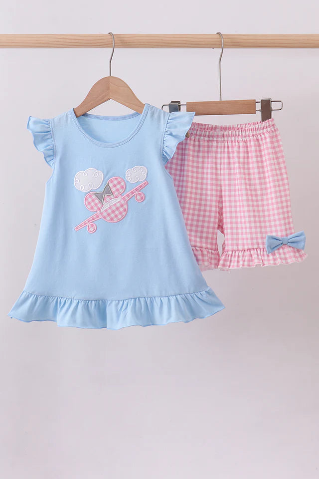 Girls Blue Mouse Plane Smocked Set