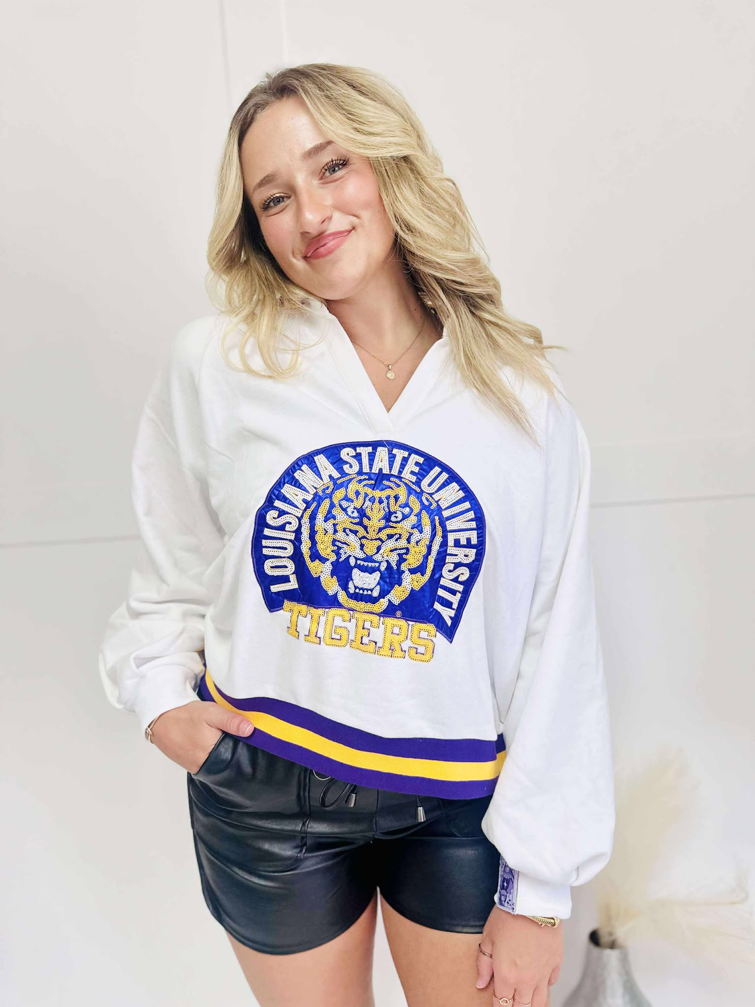 Queen Of Sparkles Licensed LSU Striped Collar Circular Mascot Sweatshirt