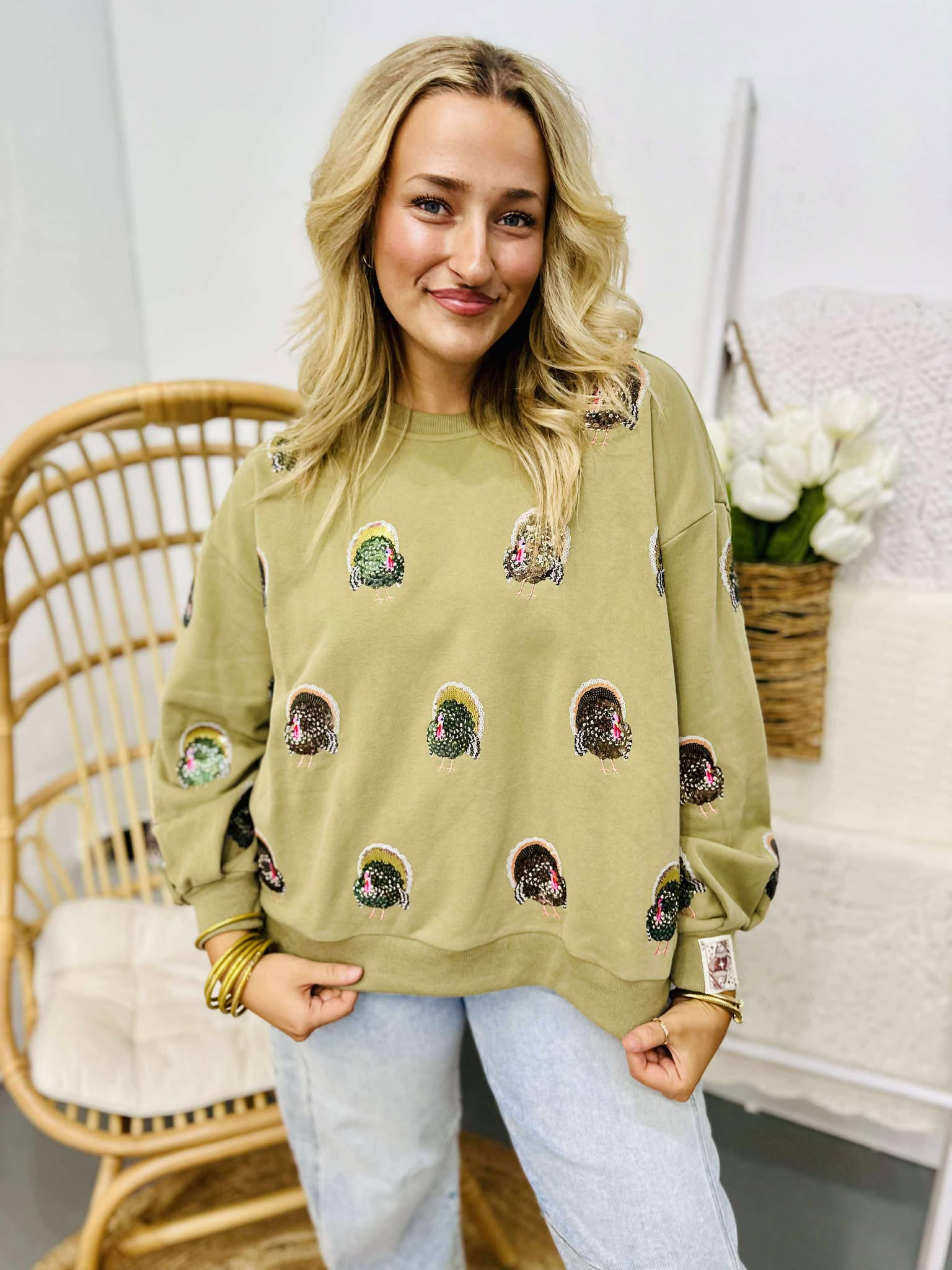 Queen Of Sparkles Olive Green Scattered Turkey Sweatshirt