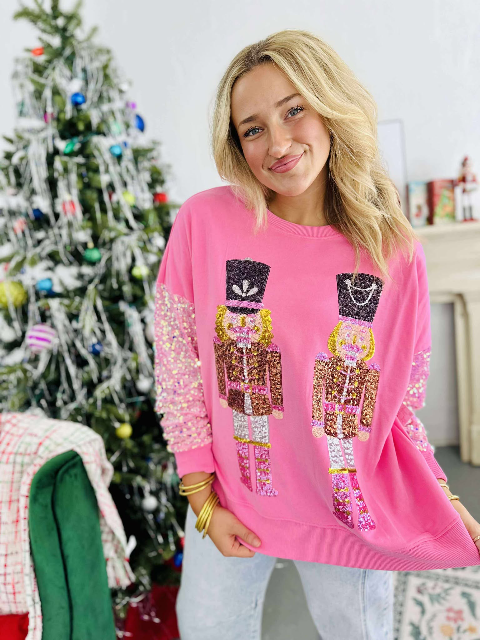 Pink Sequin Sleeve Nutcracker Pullover
