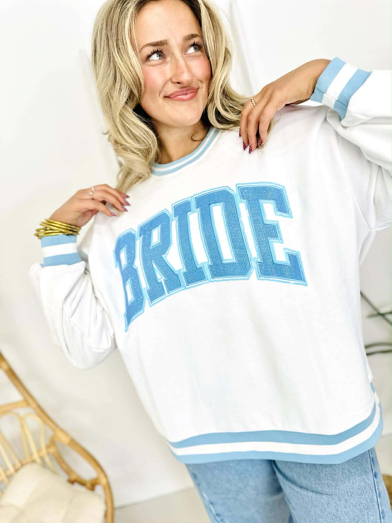 Queen Of Sparkles White & Blue Rhinestone 'Bride' Sweatshirt