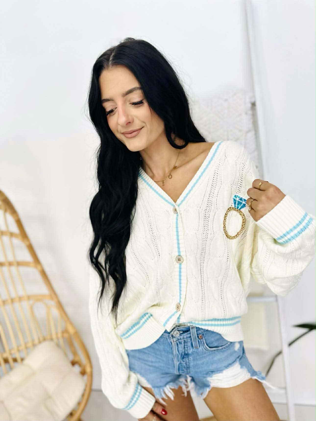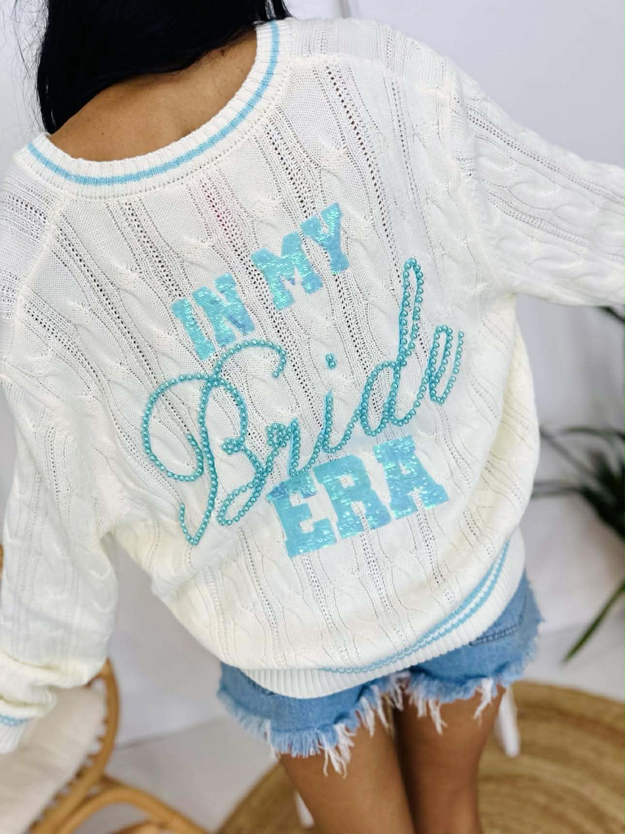 Queen Of Sparkles White & Blue 'In My Bride Era' Sequin & Pearl Button Up Cardigan