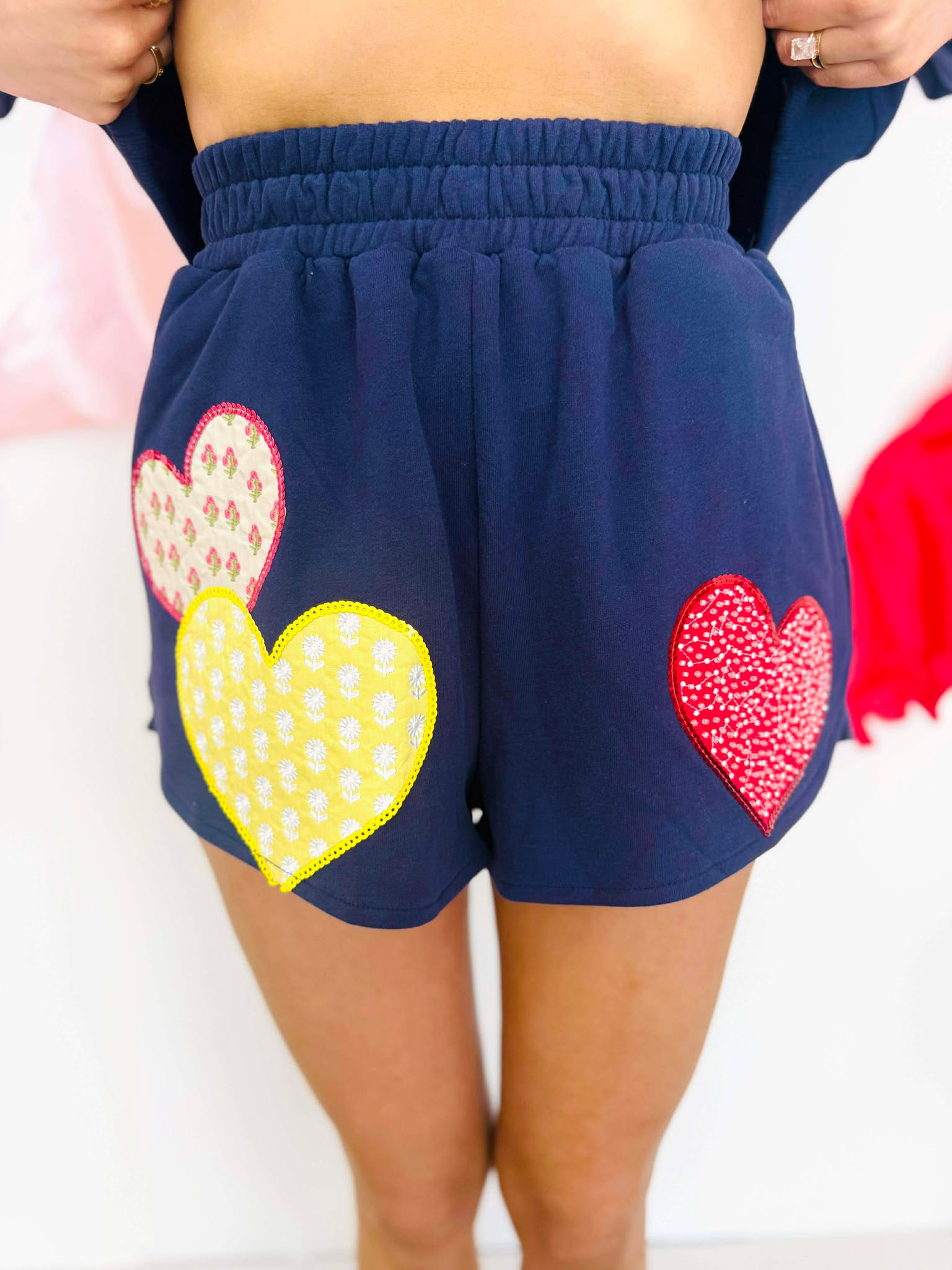 Queen Of Sparkles Navy Multi Embroidered Hearts Short
