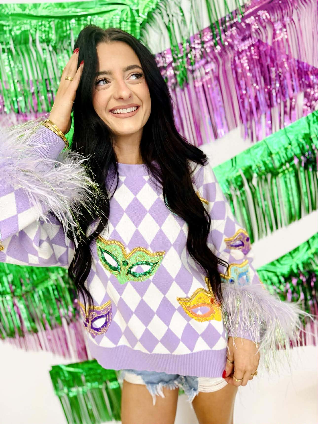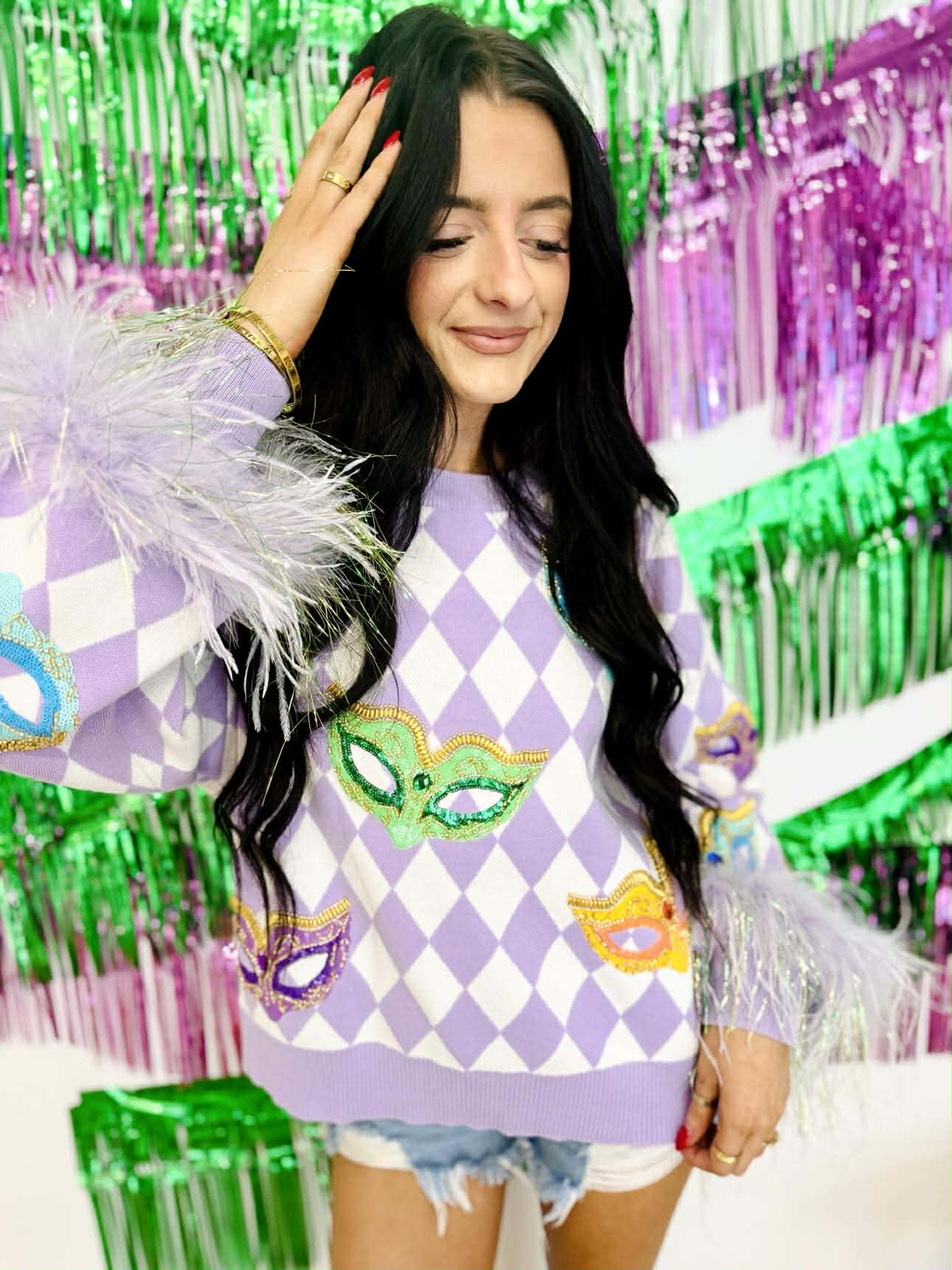 Queen Of Sparkles Lavender & White Diamond Print Multi Mask Feather Sleeve Sweater