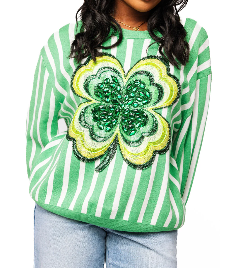 Queen Of Sparkles Green & White Stripe Shamrock Sweater