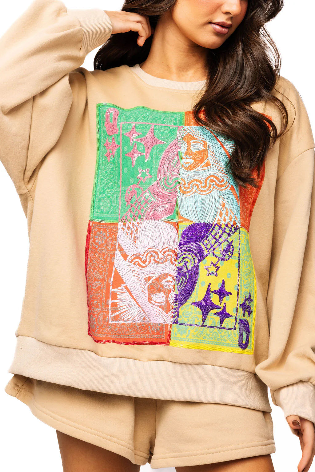 Queen Of Sparkles Beige Colorblock Bandana QOS Card Logo Sweatshirt
