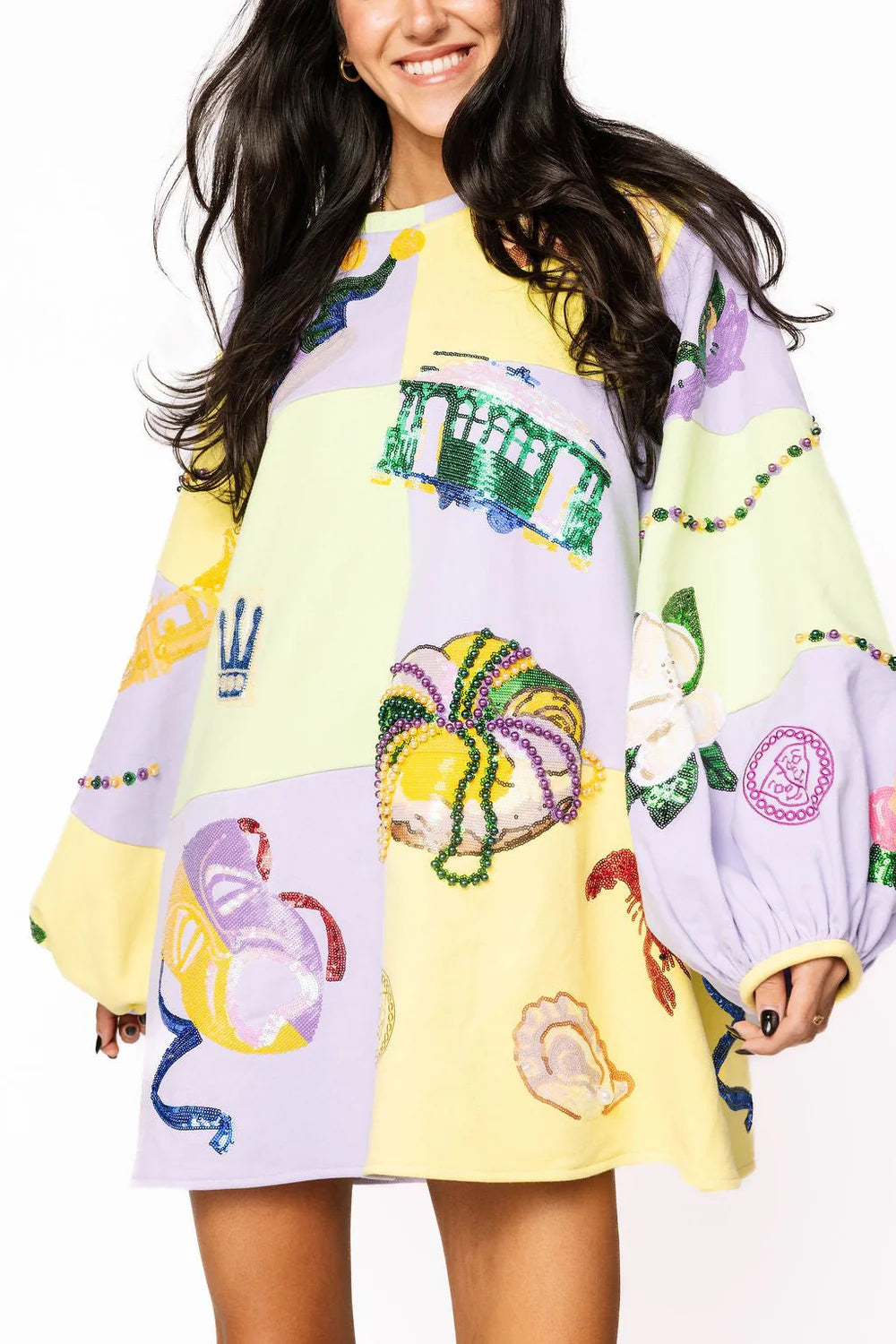 Queen Of Sparkles Checkered Mardi Gras Icon Balloon Sleeve Dress